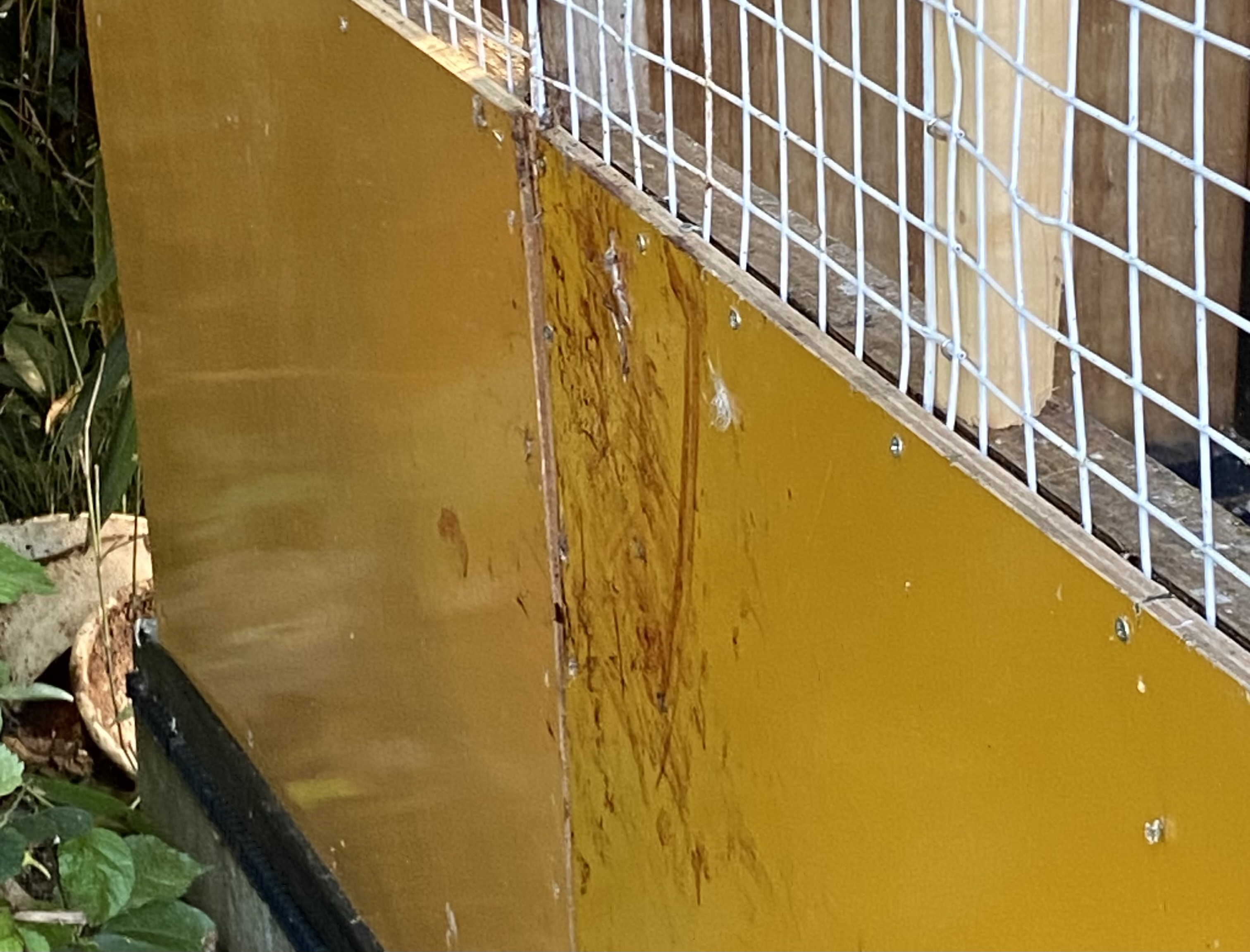 鳩小屋 入れなくて外からガジガジしたらしい?…後日、小屋内で足を怪我している鳩を見つけました。外から足だけ齧られた鳩の血のようです。