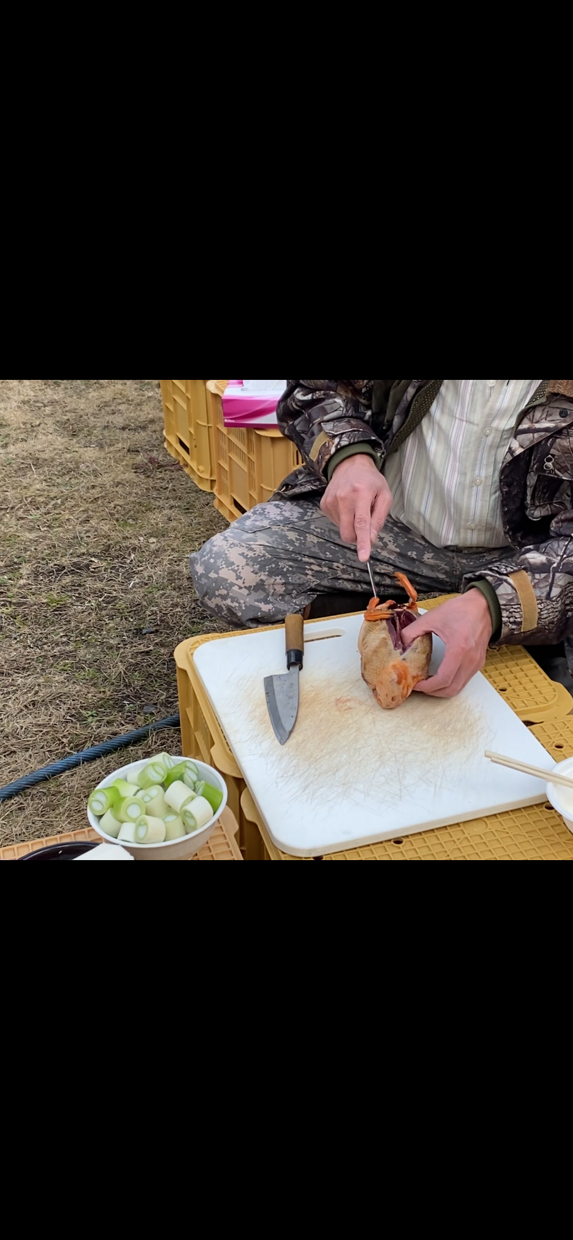 研修会2日目 今年のカモ捌き方講座(バーベキューの準備ともいう)担当は井上鷹匠に。普通の出刃包丁より小出刃派のお仲間発見。